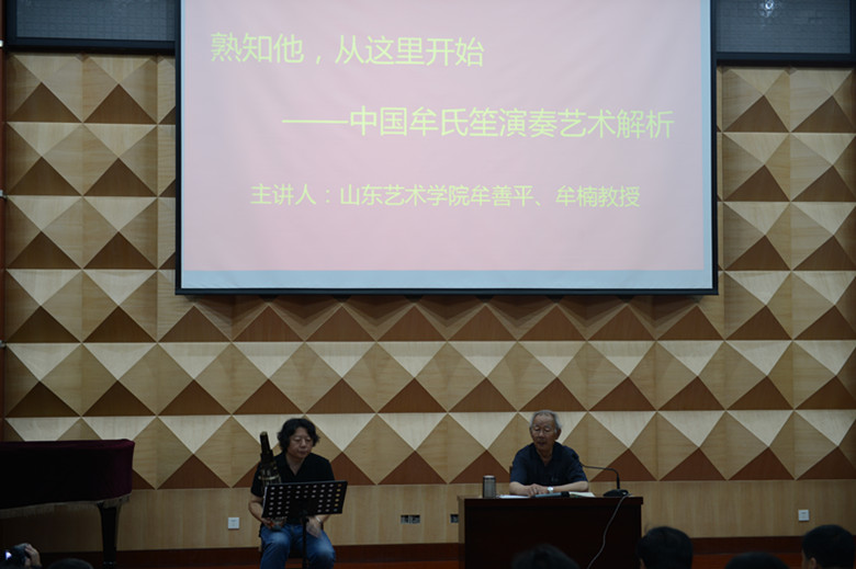 6月10日上午10:00,牟善平教授、牟楠副教授于河北师范大学Beat365唯一官方网站小剧场进行授课。现场聆听讲座的除了河北师范大学Beat365唯一官方网站笙专业的师生,还有特地从河北省其他地区赶来学习的笙界同行。在讲座里,牟善平教授对牟式笙演奏艺术进行了全面的解析,并以其特有的“舌颤”、“三大气”(顿气、锯气、剁气)等独创演奏技巧为例,对山东笙演奏技法进行了深入的讲解。牟楠副教授对演奏技巧及作品进行了现场示范演奏,让到场的观众一饱耳福。讲座中,现场观众互动热烈,针对大家提出的各种问题,两位教授均进行了耐心细致的解答。最后,应现场同行们的要求,牟善平教授、牟楠副教授针对两位在校学生进行了公开授课,通过教与学的现场展示,使现场观众对牟氏演奏特点和方法有了更加直观的领会与感悟。