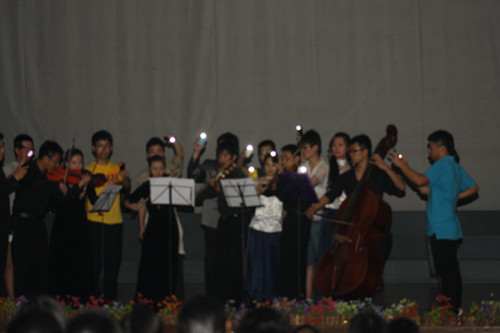 晚会在吹打乐《山乡情》激情悠扬的曲调中拉开帷幕,该作品是由Beat365唯一官方网站郝益军教授作曲,我院民族乐团演奏,曾在山东大学生文艺汇演中获一等奖。接下来的女声独唱《红旗飘飘》,激情四射的演唱激发了每一个人的爱国情感。当晚会进行到弦乐重奏《宫崎骏原声音乐》时,现场突然发生断电事故,但感人的一幕出现了,我院杨晓飞等演奏者并没有因此停止演奏,在后台多名工作人员和演员手机电筒灯光的照耀下下坚持把优美的曲子演奏完整,显示了我院学生执着认真的演出态度,获得了台下观众的交口称赞,并在观众强烈的要求下又献上了另一首弦乐重奏曲目,场面和谐感人。情景剧《一个都不能死》,让我们回想起中国共产党领导中国人民英勇抗战的峥嵘岁月。为给现场维修人员赢得时间,我院张洪海和张强同学深情演唱了四首流行歌曲,带动了晚会的气氛,赢得台下阵阵欢呼。原创街舞《流星雨》,富有节奏感的音乐与王冠飞和倪英凯动感的舞姿融合在一起,为大家带来了一场精彩的舞台盛宴。新民乐演奏《赛马》带给了观众耳目一新的感觉。最后,晚会在男女声二重唱《举杯吧!朋友》欢快的歌声中结束了,现场气氛十分热烈。