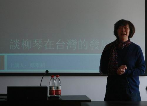 郑翠苹女士现任台湾台北柳琴室内乐团团长,长期致力于柳琴的教育、推广以及柳琴音乐的创作。在题为《谈柳琴在台湾的发展状况》的学术讲座中,郑女士主要介绍了柳琴在台湾的发展概况及由台北柳琴室内乐团委约的柳琴新作。她认为在柳琴作品的创作方面,对不同风格的作品都要持接纳态度,对青年作曲家们更要加以扶持,鼓励他们创作更多的作品。在她所介绍的近几年新创作的柳琴作品中《夜之绮想》、《罗蕾莱》等作品都于当晚的音乐会中上演,给了在座师生听觉上的新感受,也让大家了解了台湾地区的柳琴发展情况。